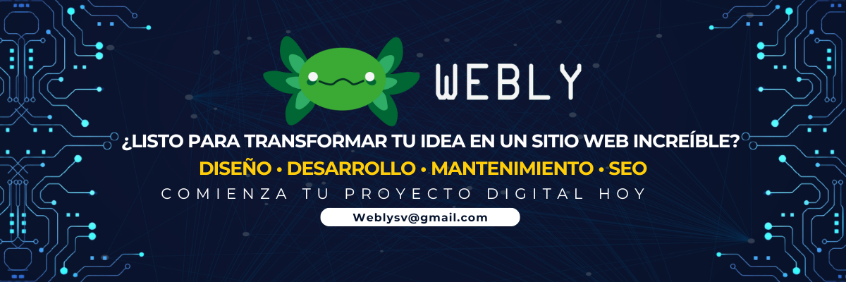 Somos Webly, una microempresa salvadoreña especializada en el desarrollo, diseño y mantenimiento de sitios web. Utilizamos herramientas modernas para ofrecer plataformas rápidas, seguras y con una experiencia de usuario intuitiva. Nuestro objetivo es ayudarte a crecer, conectar y posicionarte en línea con impacto.